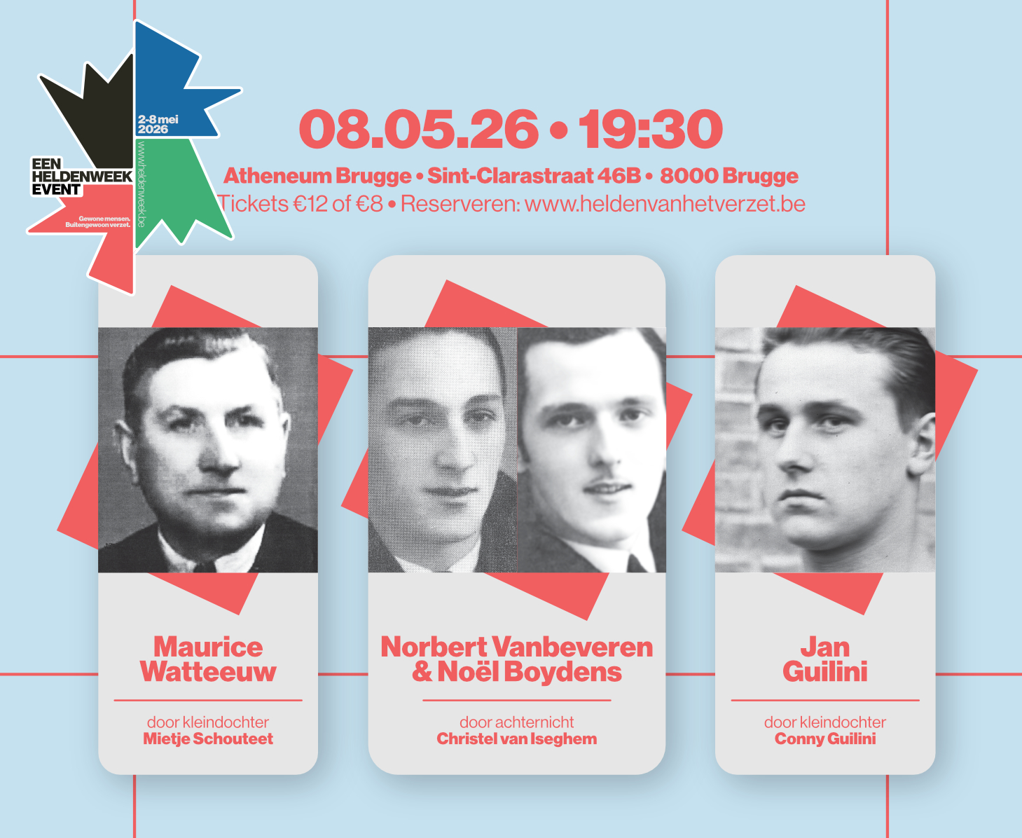 Tijdens deze avond brengen we lokale geschiedenis tot leven met persoonlijke en aangrijpende verhalen verteld door de nakomelingen van zij die tijdens de oorlog de moed vonden om weerstand te bieden: Maurice Watteeuw (door kleindochter Mietje Schouteet), Norbert Vanbeveren & Noël Boydens (door achternicht Christel van Iseghem) en Jan Guilini (door kleindochter Conny Guilini).